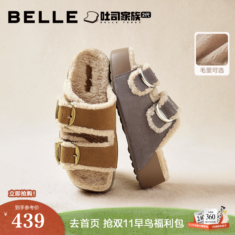 百丽复古加毛生巧吐司2代勃肯鞋女2025冬季新款厚底拖鞋B2832DT5