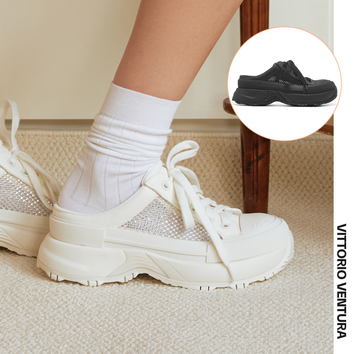 VITTORIO VENTURA薇薇燃 牛皮拼接钻网一脚蹬包头厚底拖鞋