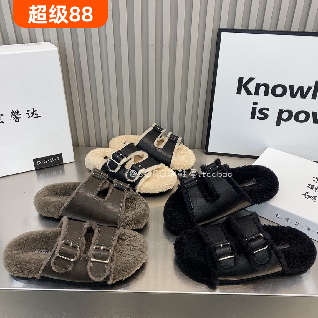欧货磨砂真皮金属扣包头半拖鞋羊羔毛毛鞋大头卡皮巴拉勃肯女鞋托