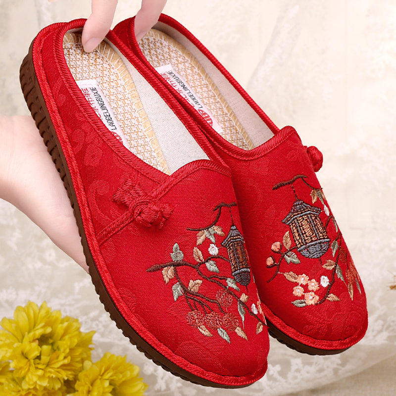 老北京布鞋女夏透气半拖鞋外穿民族风中老年绣花鞋软底舒适妈妈鞋