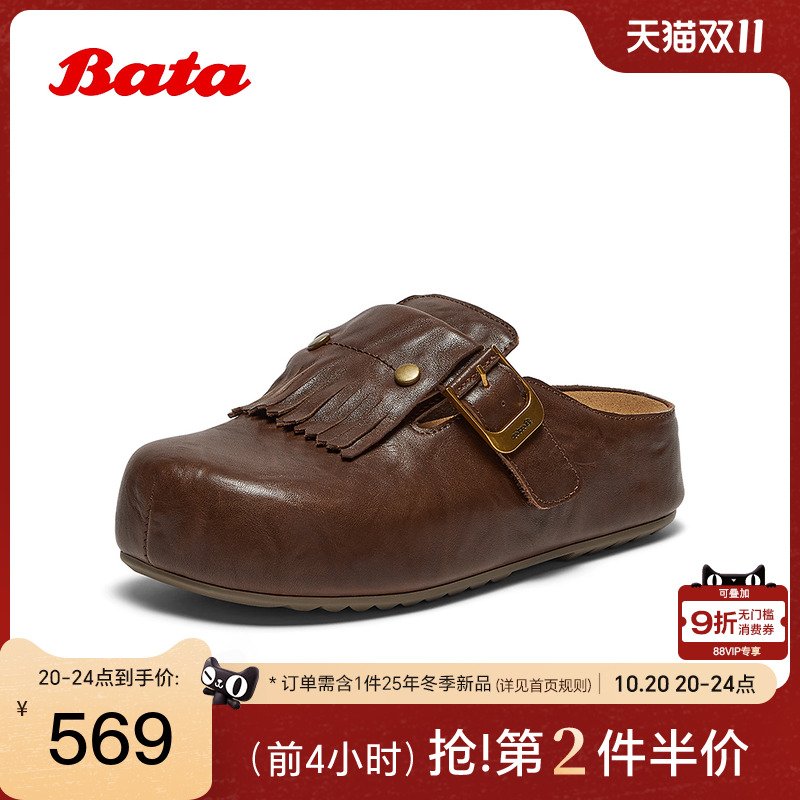 Bata勃肯拖鞋女2025春秋商场新款英伦风牛剖皮厚底一脚蹬2823DAH6