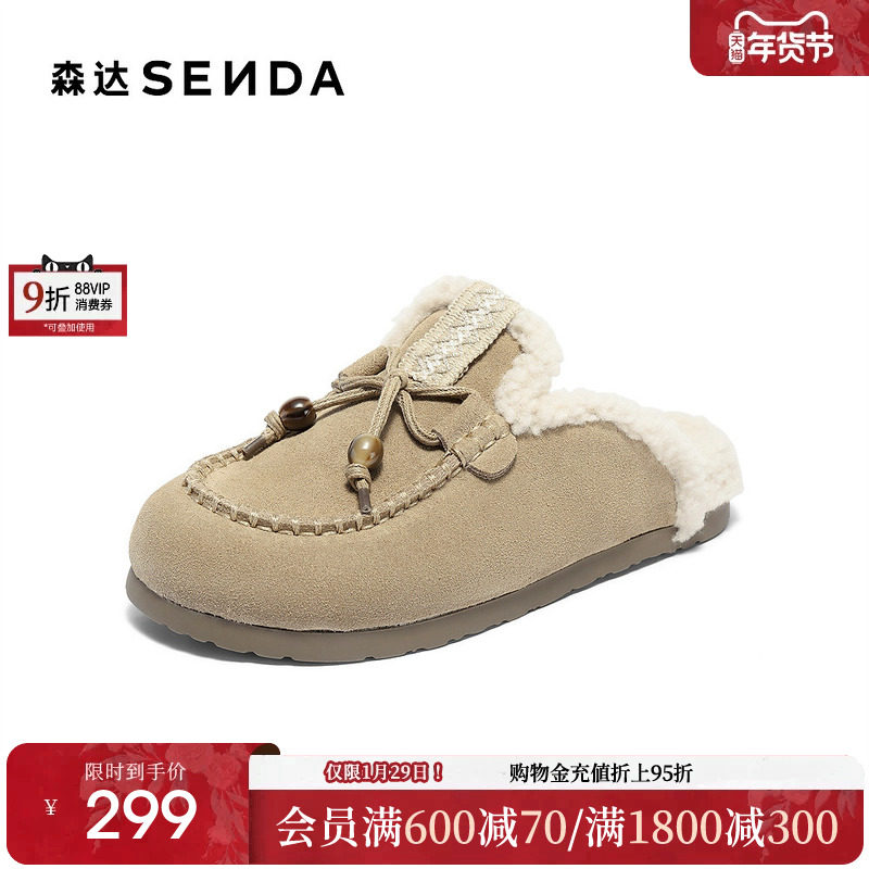 森达真皮毛毛鞋女2025冬新商场同款加绒加厚东北保暖拖鞋XST01DT5