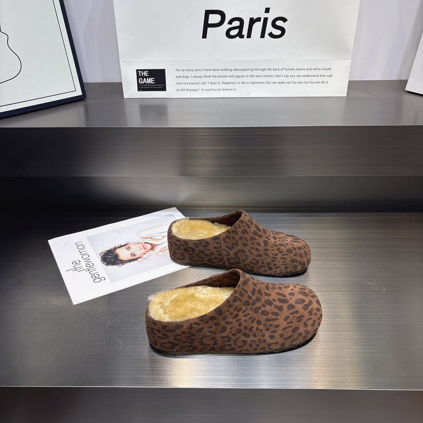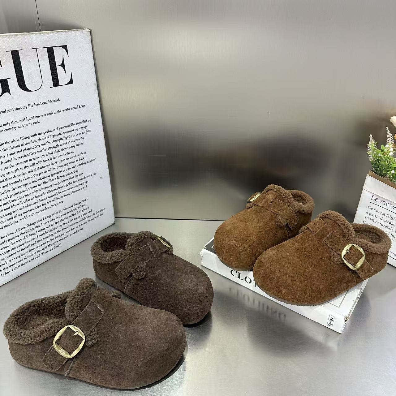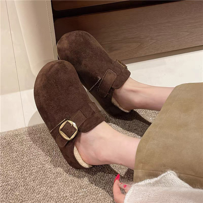 米新款2025秋冬英伦风真皮加绒平底时尚保暖勃肯鞋女包头舒适拖鞋