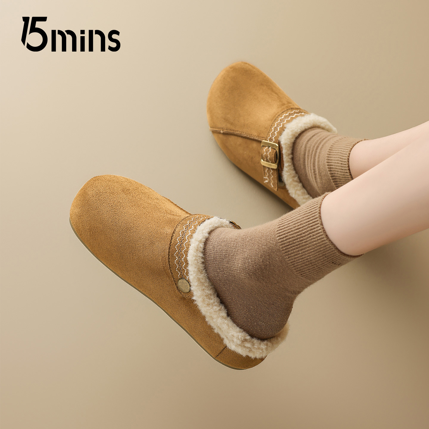 15mins韩版加绒勃肯鞋女士2025新款冬季百搭保暖毛绒包头加棉拖鞋