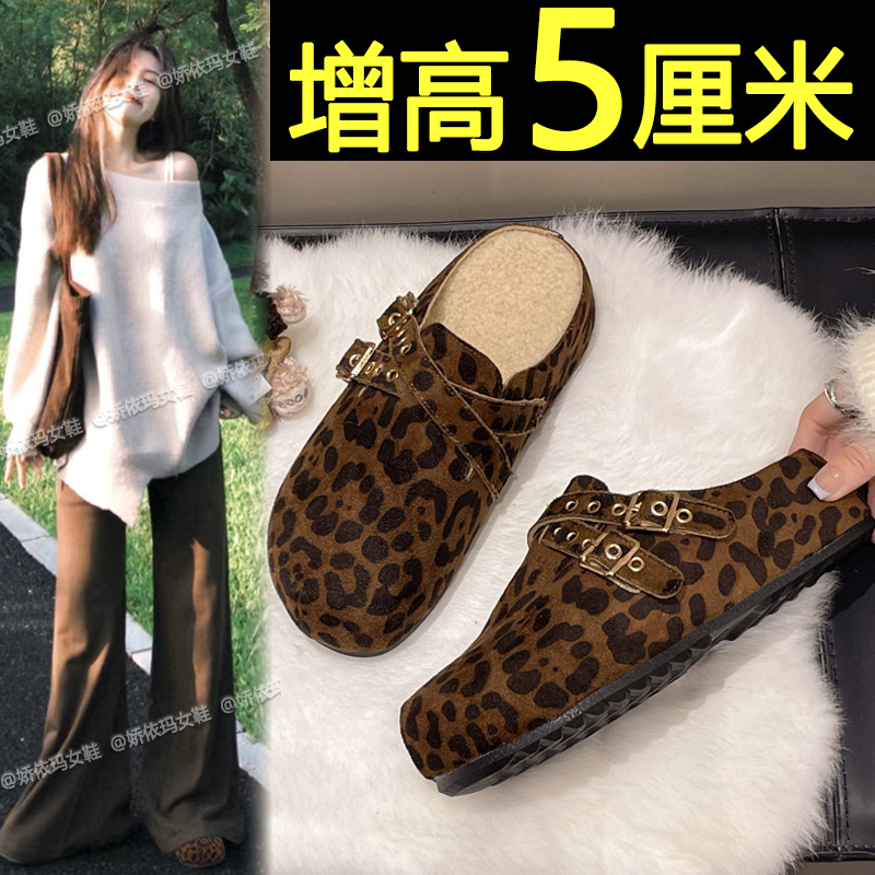 豹纹色加绒包头厚底勃肯鞋女2025新款百搭增高显瘦防滑外穿拖鞋女
