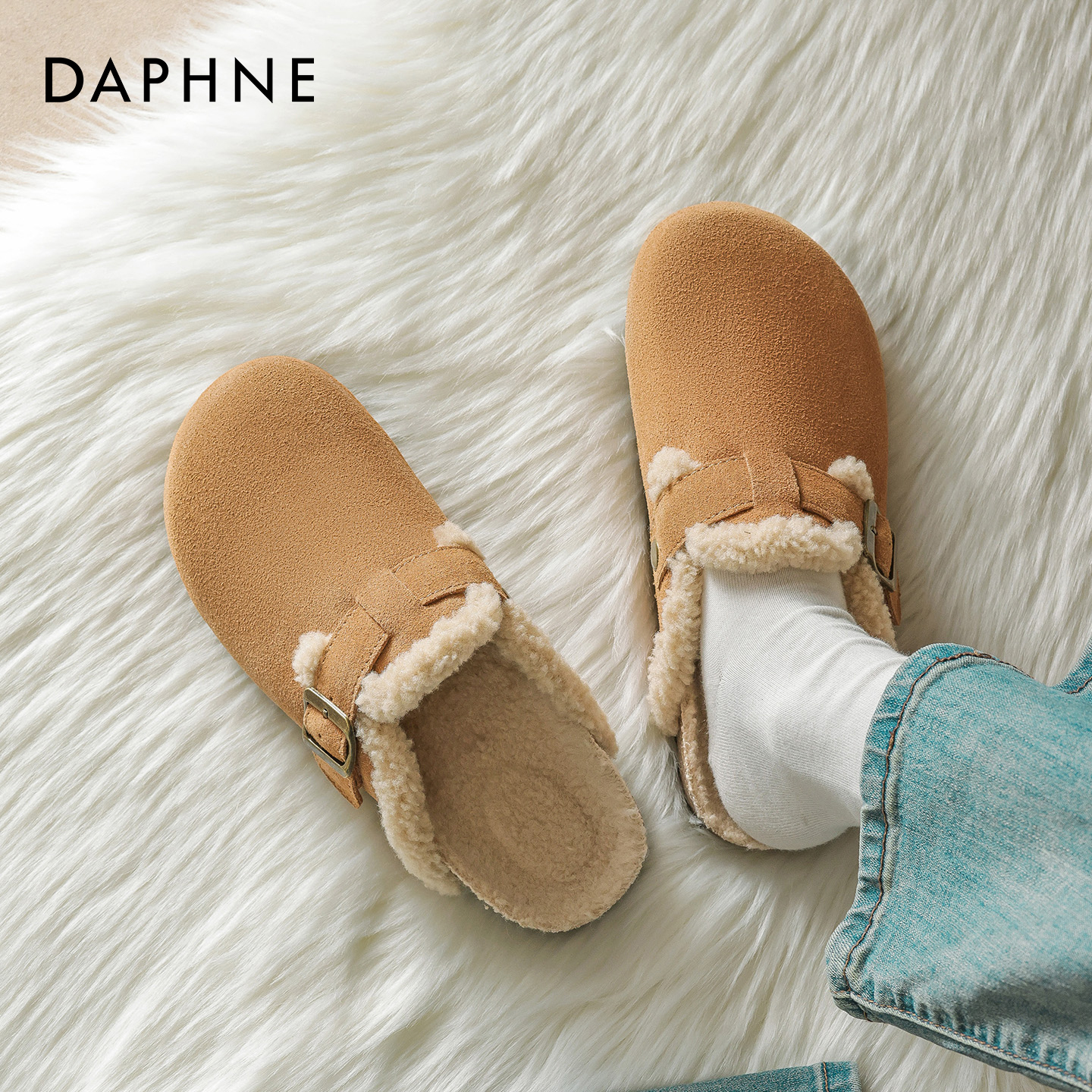 达芙妮加绒厚底勃肯鞋女2025秋冬新款一脚蹬包头拖鞋休闲孕妇棉鞋