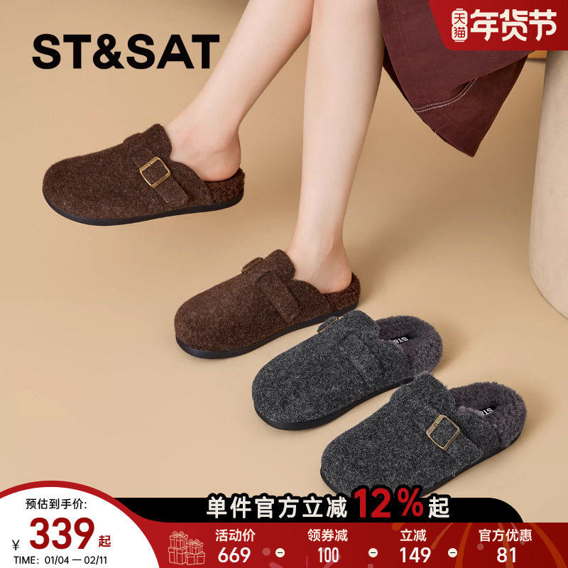 星期六女鞋加绒拖鞋女2025新款冬季棕色一脚蹬真皮勃肯鞋保暖半拖