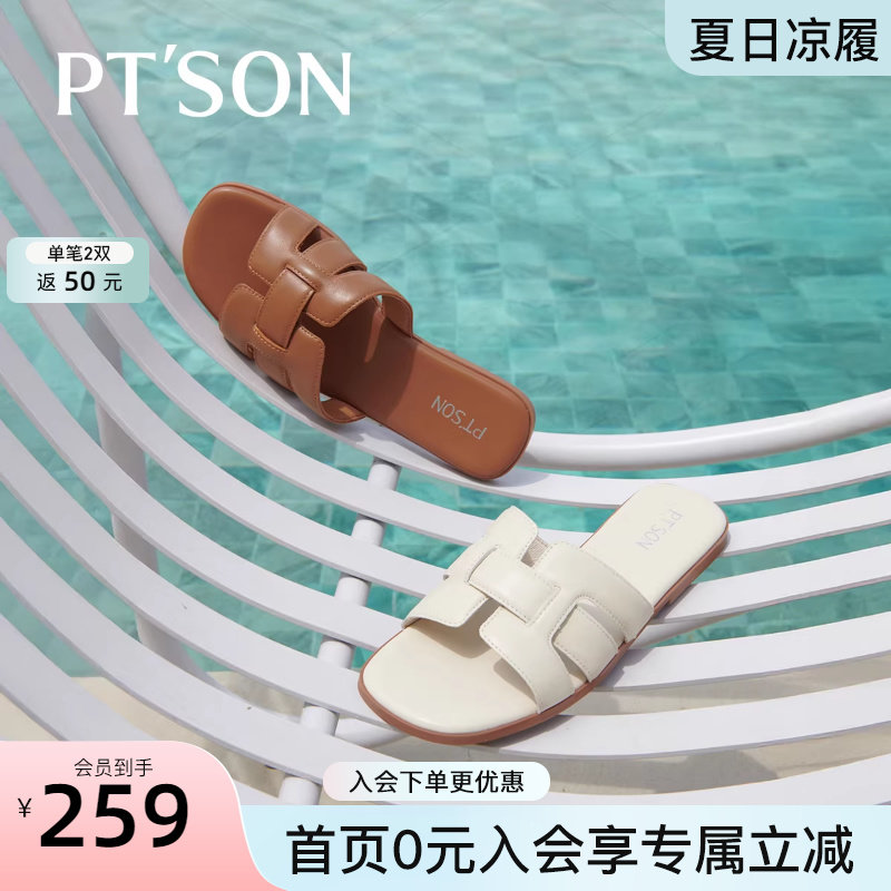 百田森羊皮平底拖鞋女夏外穿配裙子编织拖鞋法式小凉拖一脚蹬鞋拖