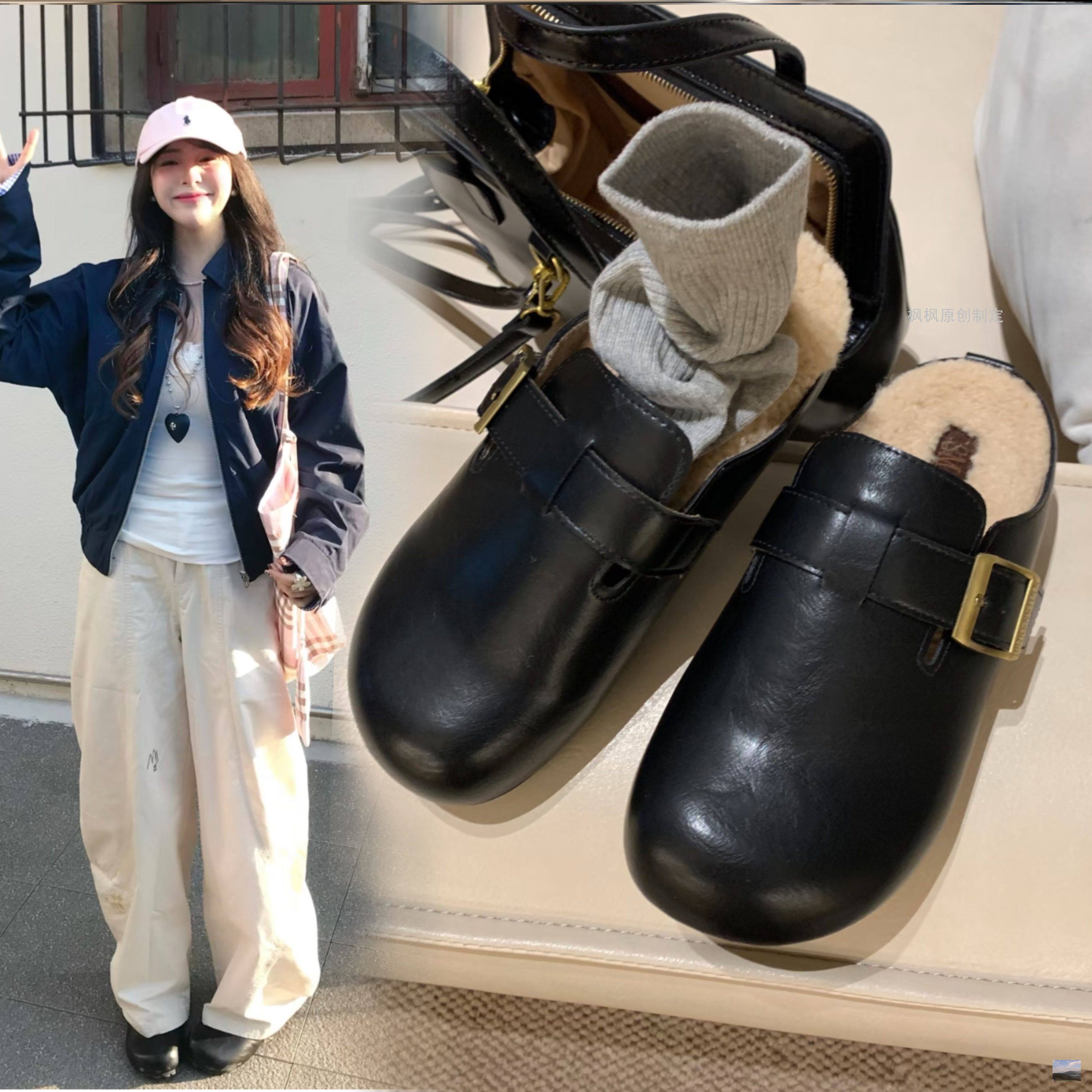 赵露思同款毛毛包头半拖鞋软皮勃肯鞋外穿厚底加绒棉鞋保暖穆勒鞋