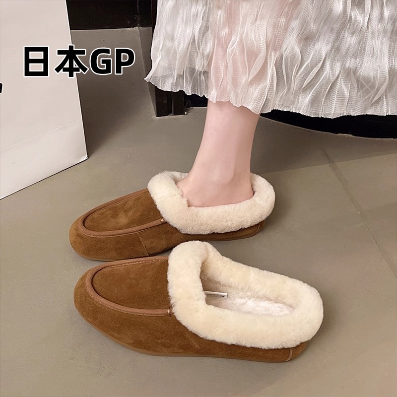 日本GP防滑毛毛勃肯棉拖鞋女2025冬新款百搭一脚蹬平底加绒雪地靴