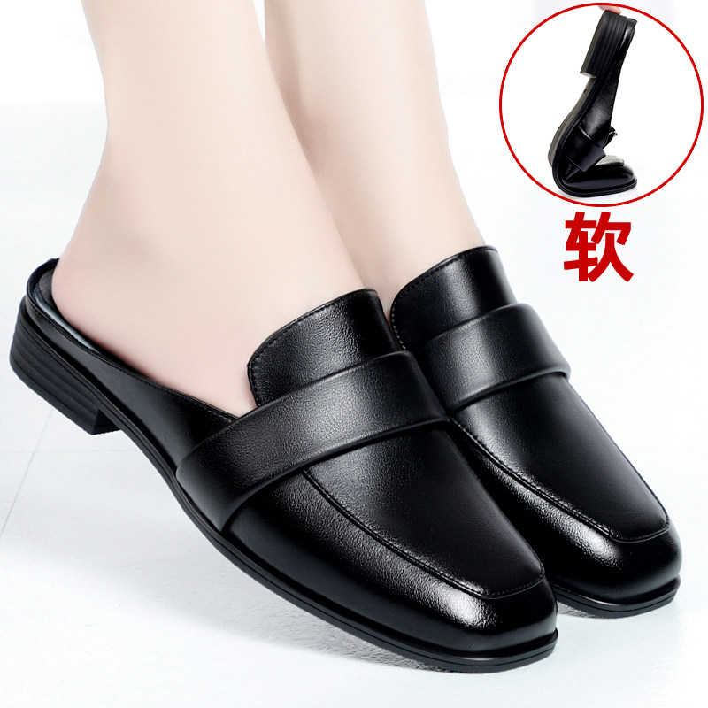 包头半拖鞋女夏外穿真皮平底低跟粗跟凉拖鞋半托单鞋皮拖防滑女鞋