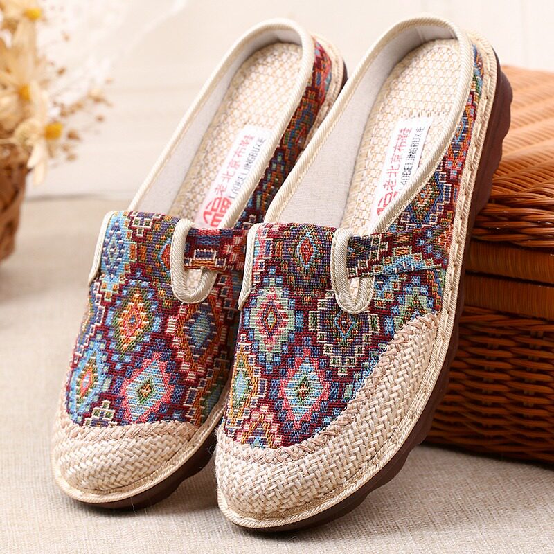 老北京布鞋女春夏季透气包头半拖鞋亚麻凉拖软底民族风妈妈绣花鞋
