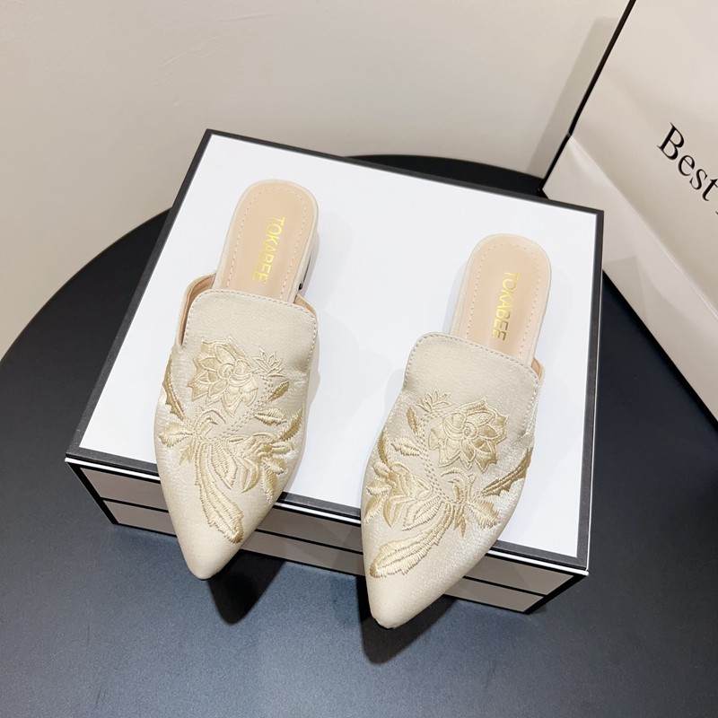 国风新中式刺绣复古2024春夏新款粗中跟尖头包头外穿穆勒半拖鞋女