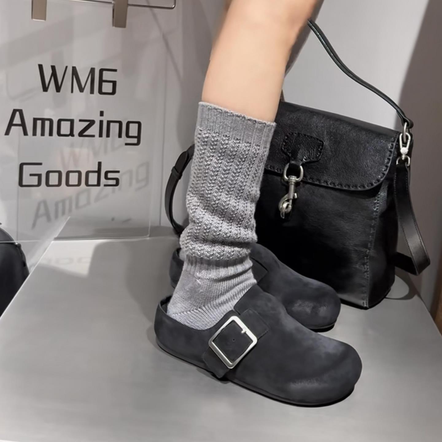WM6欧货女鞋2025秋冬新款牛猄圆头皮带扣一脚蹬平底勃肯包头拖鞋