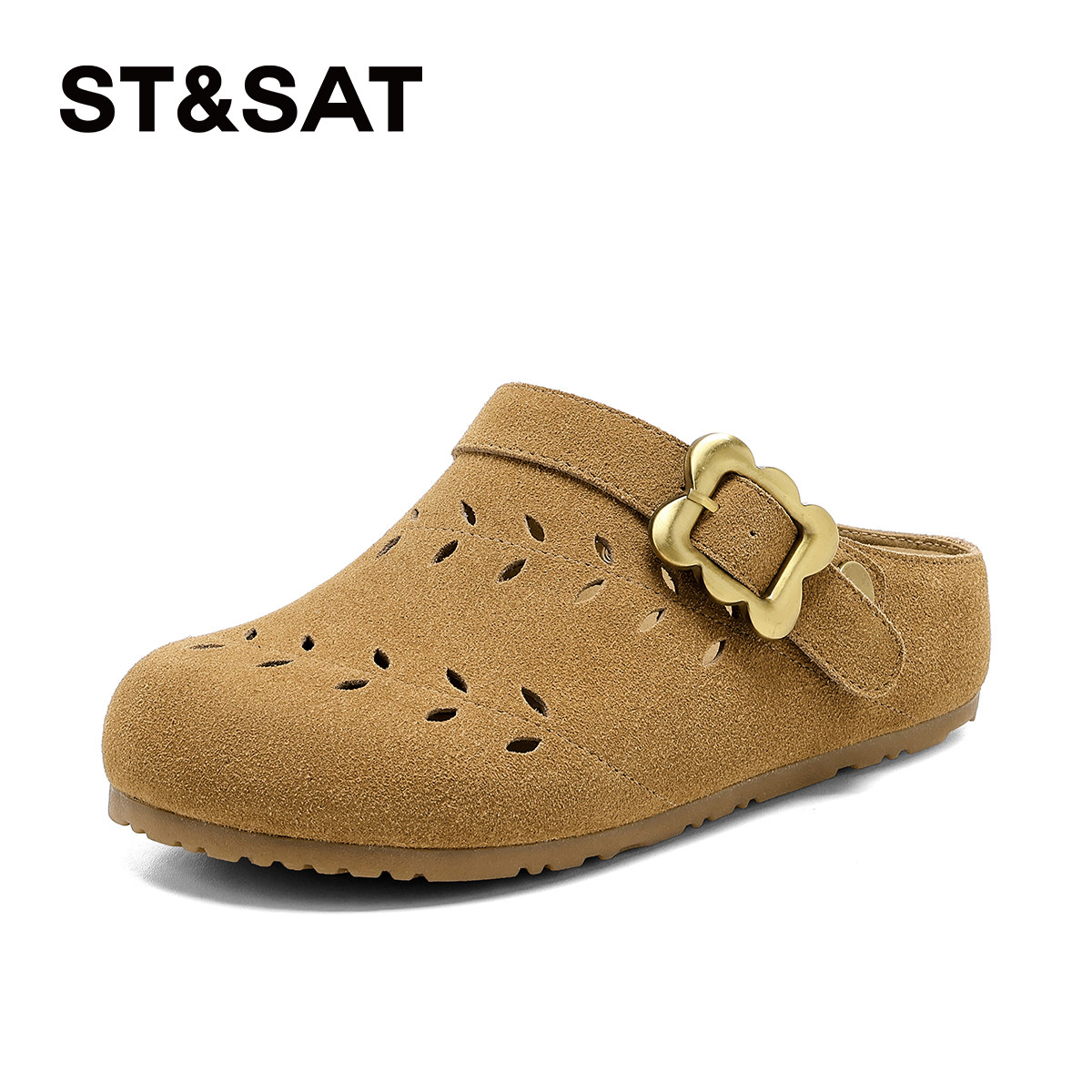 星期六真皮勃肯鞋女2026春季新款镂空包头拖鞋懒人一脚蹬软木鞋子