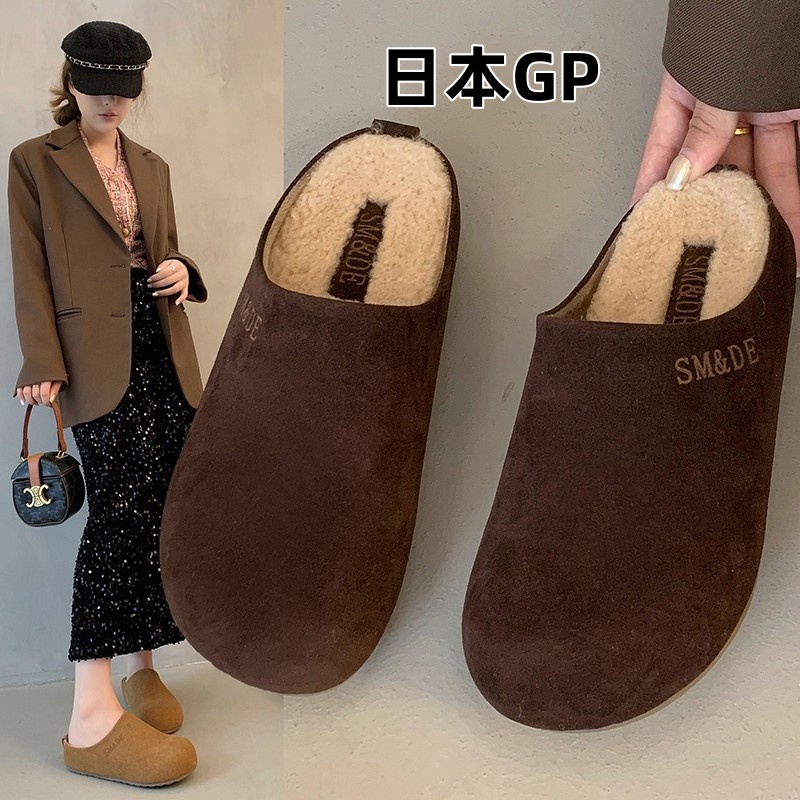 日本GP简约时尚加绒包头半拖鞋女外穿2025秋新款厚底小个子勃肯鞋