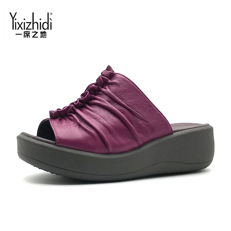 一席之地新款纯皮平底厚底圆头高脚面休闲露趾拖鞋舒适胖脚友好