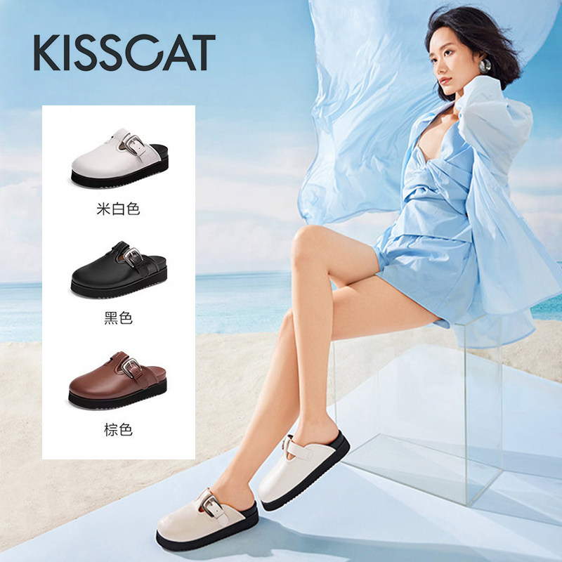 KISS CAT/接吻猫夏季牛皮勃肯鞋厚底外穿包头凉拖鞋女KA54396-51