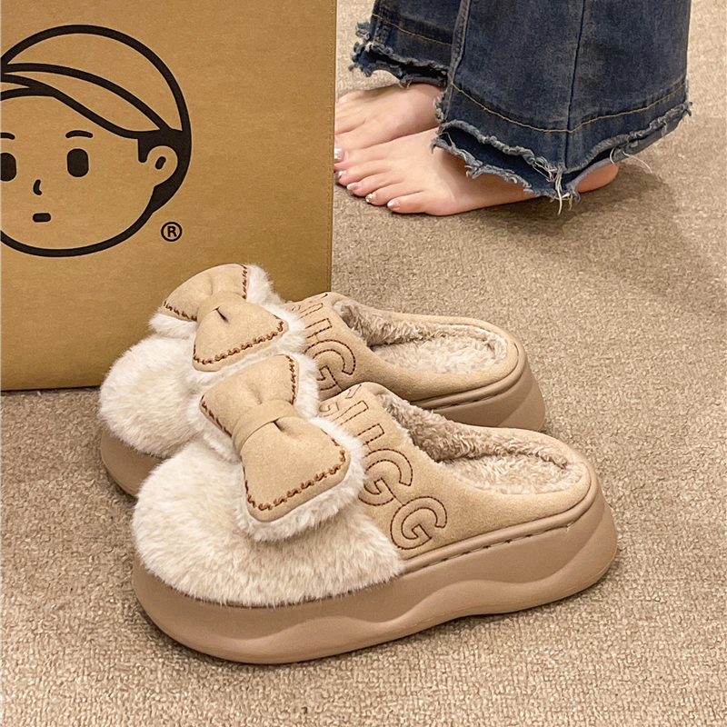 可爱蝴蝶结字母棉拖鞋女款冬季家居室内包头厚底增高加绒保暖拖鞋