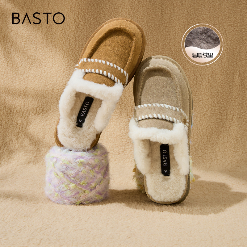 百思图休闲毛毛鞋厚底保暖拖鞋棉鞋BM207DH4Z
