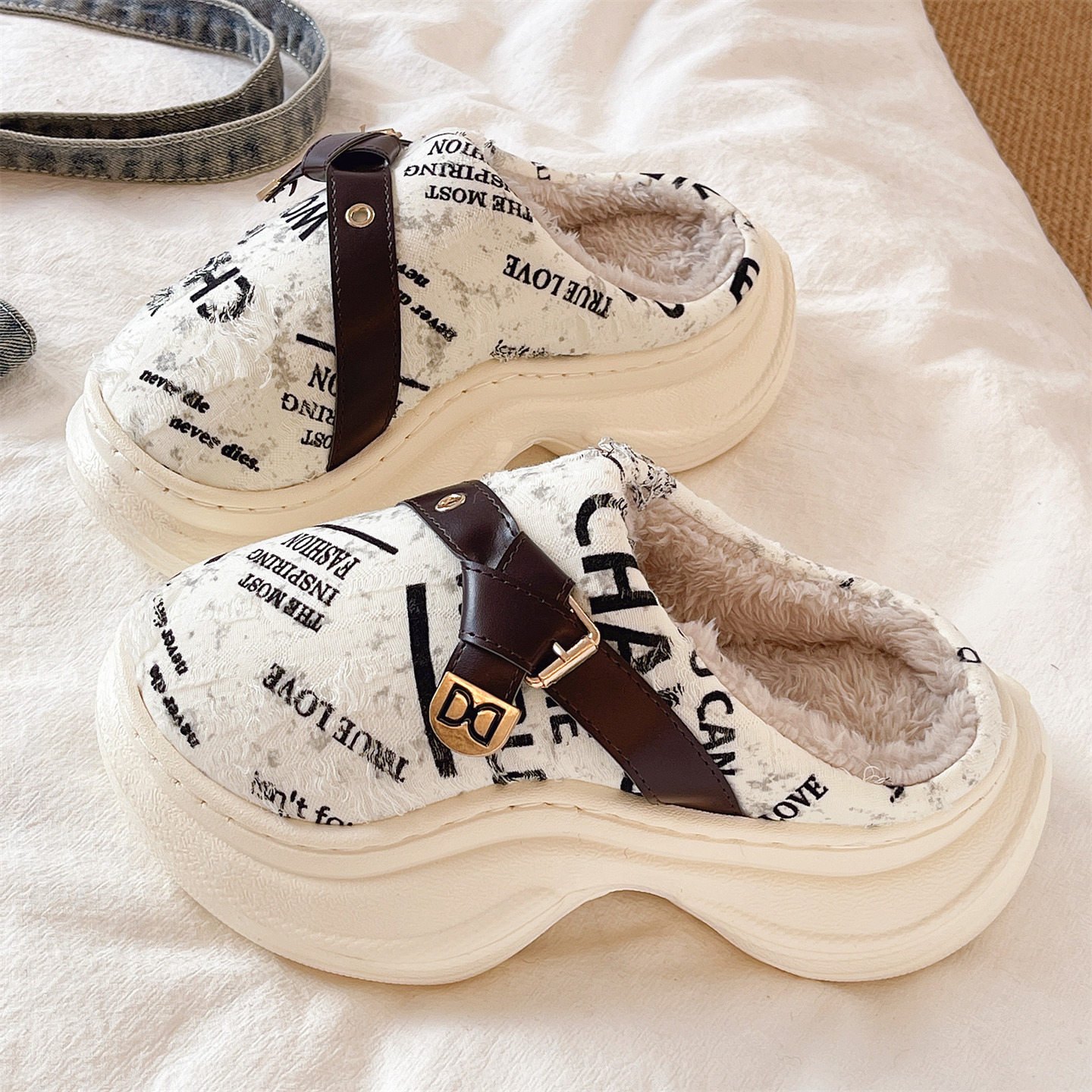 增高厚底包头拖鞋女士冬季室内外穿时尚字母皮带扣加绒保暖棉拖鞋