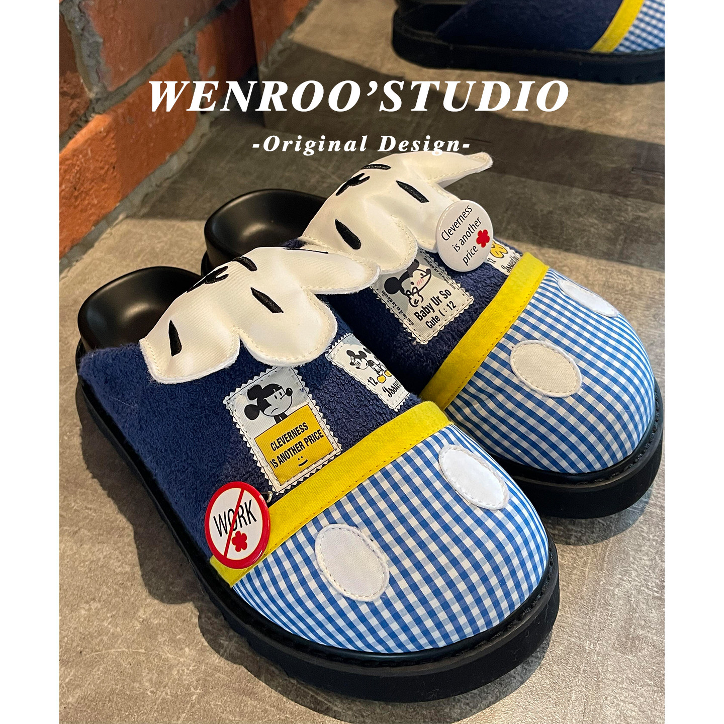 2026新款蓝色格子米奇厚底勃肯鞋女外穿一脚蹬复古增高包头半拖鞋