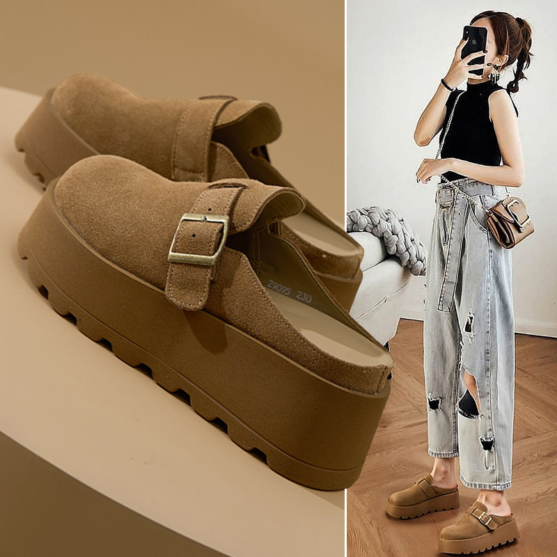 复古驼色勃肯鞋女2026正流行春款包头真皮厚底增高7cm外穿半拖鞋