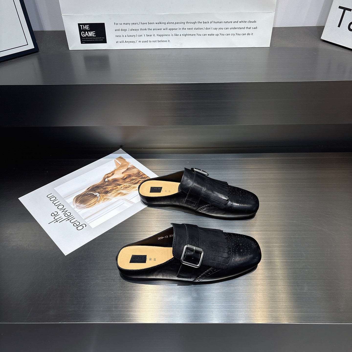 英伦风黑色流苏包头半拖鞋女2026新款头层牛皮方头搭扣软底乐福鞋