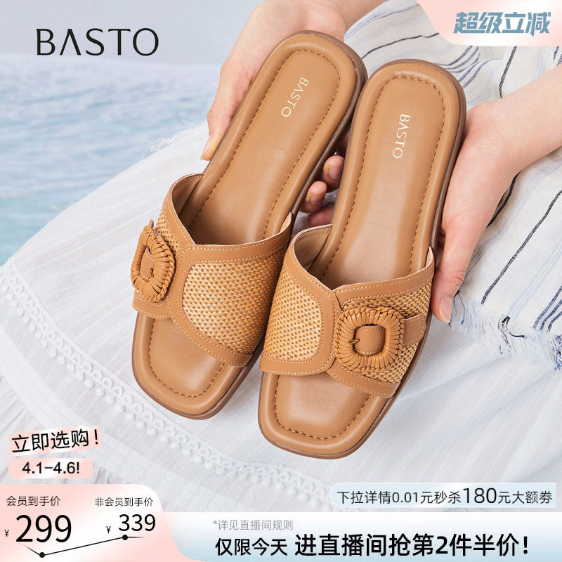 百思图2026夏季新款舒适休闲平底一字拖女外穿露趾拖鞋USI26BT6