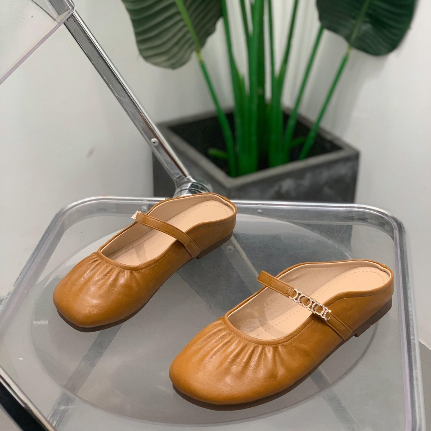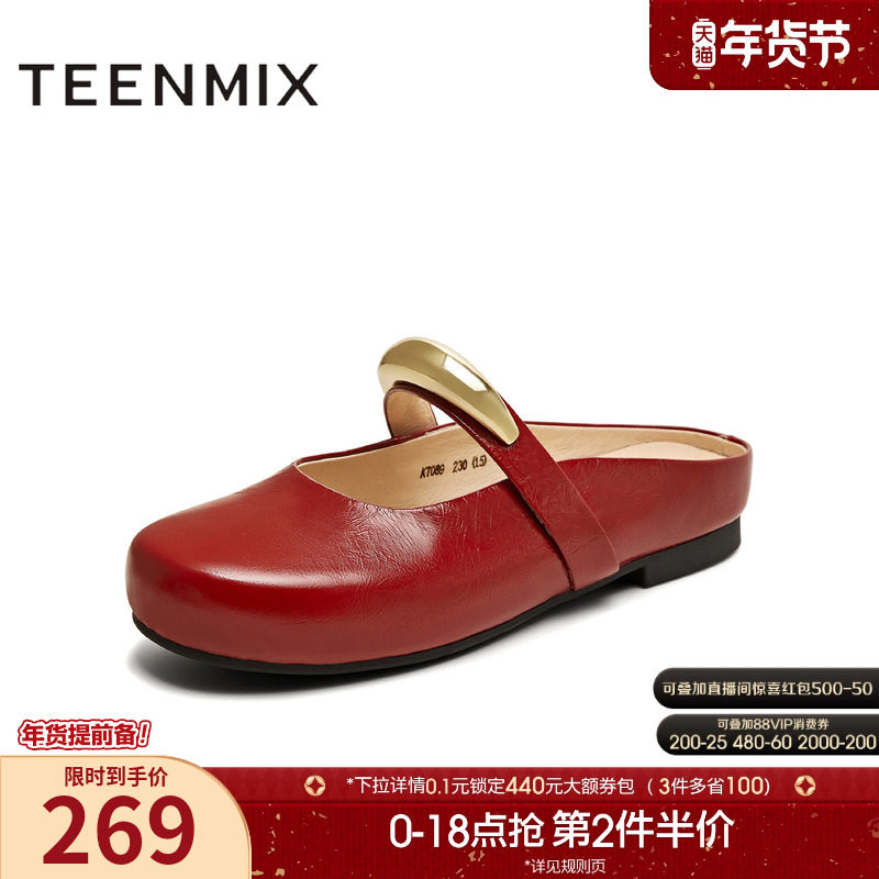 天美意平底玛丽珍皮鞋包头半拖鞋女浅口单鞋2025秋季新款KM081CQ5