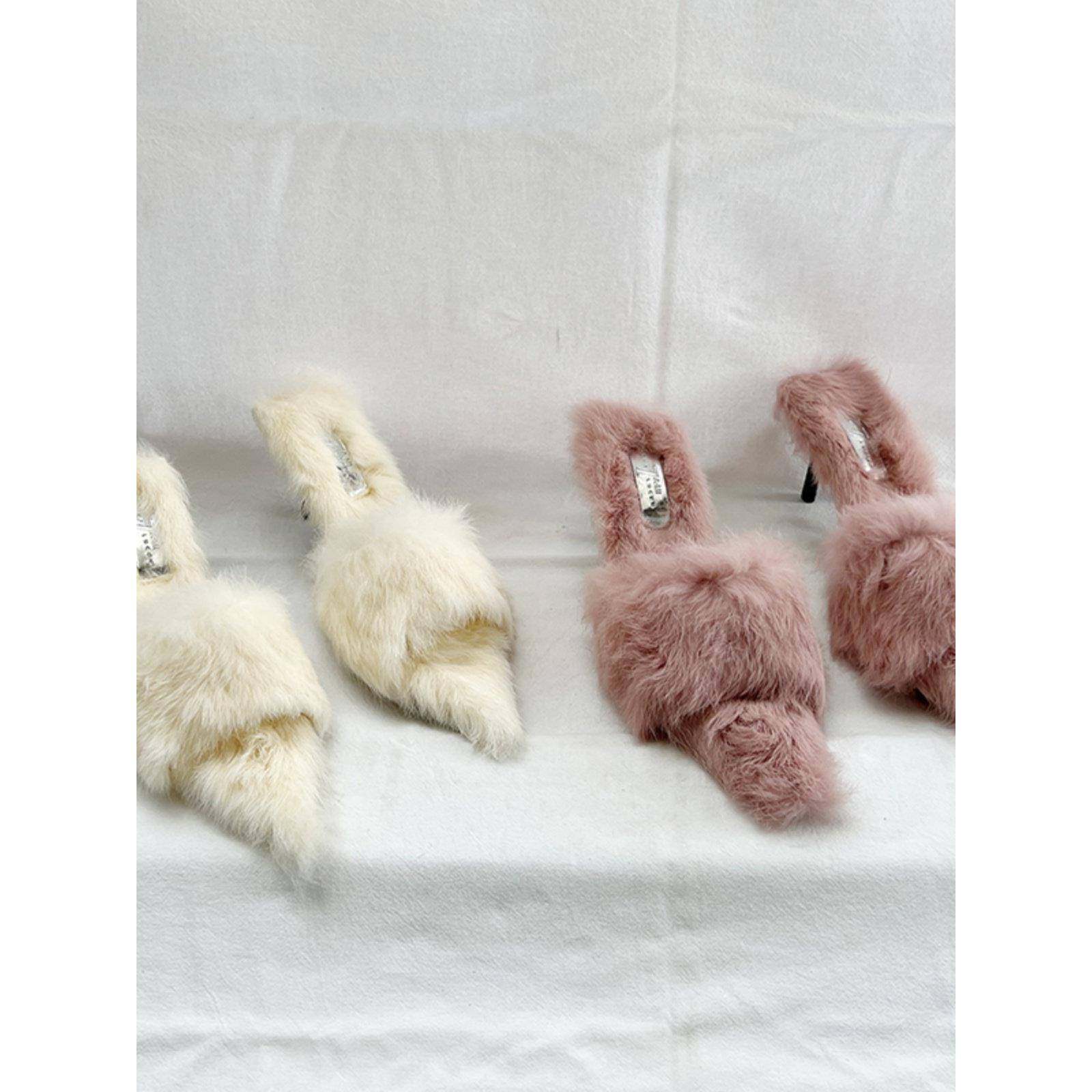欧美尖头细跟兔毛外穿露趾拖鞋女2025秋冬高跟一字带毛毛性感凉拖