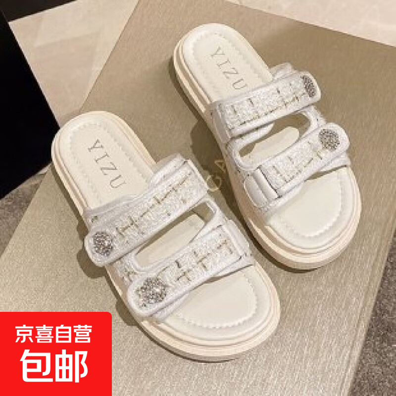 拖鞋女夏外穿2025年新款平底防滑轻便软底凉拖厚底一字拖鞋 米白色 36