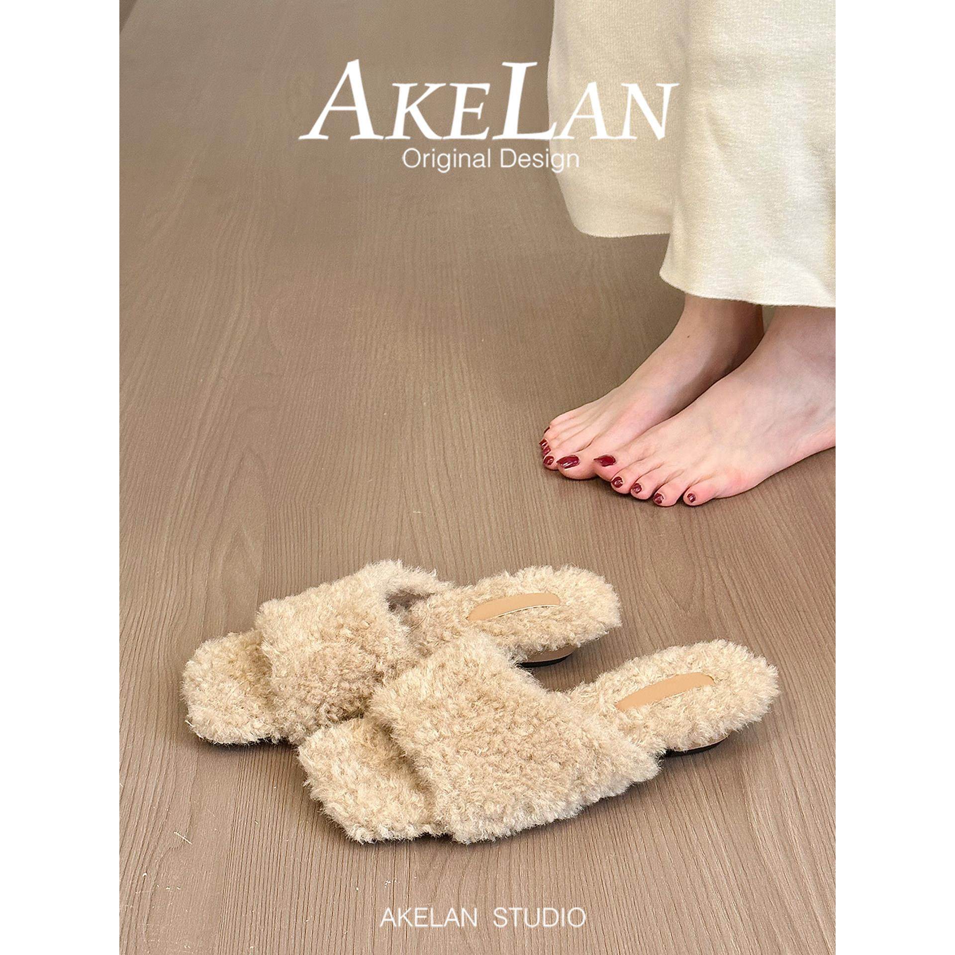 羊皮版~法式气质方头平底毛毛拖鞋女秋冬外穿百搭保暖粗跟凉拖鞋