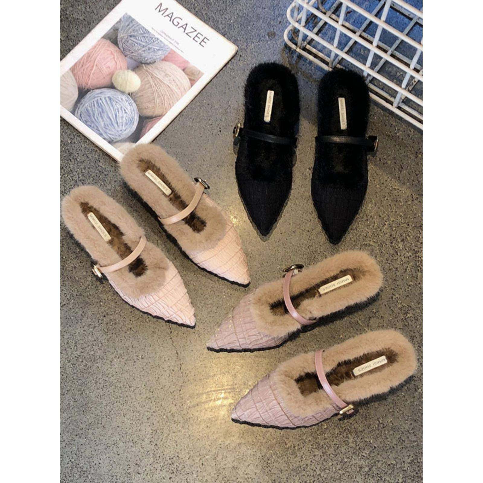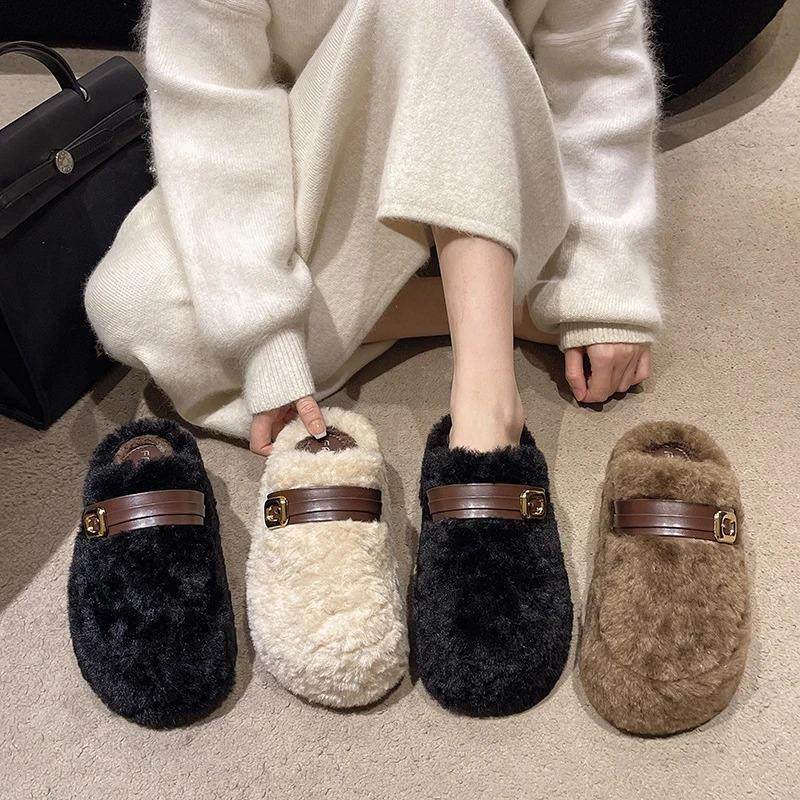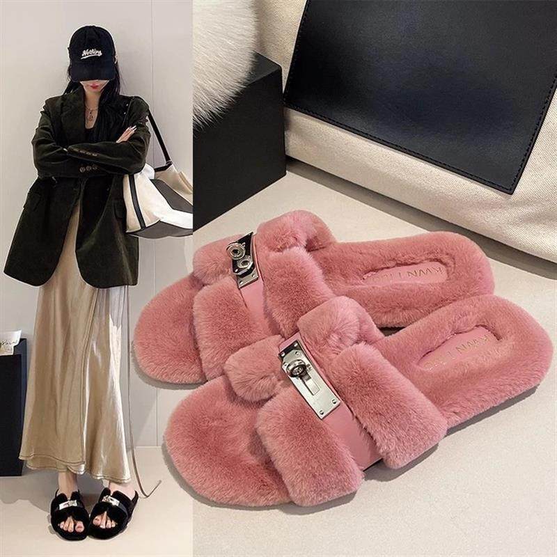 朝益潮鞋毛毛拖鞋女秋季外穿平底加绒网红一字交叉金属扣复古棉拖
