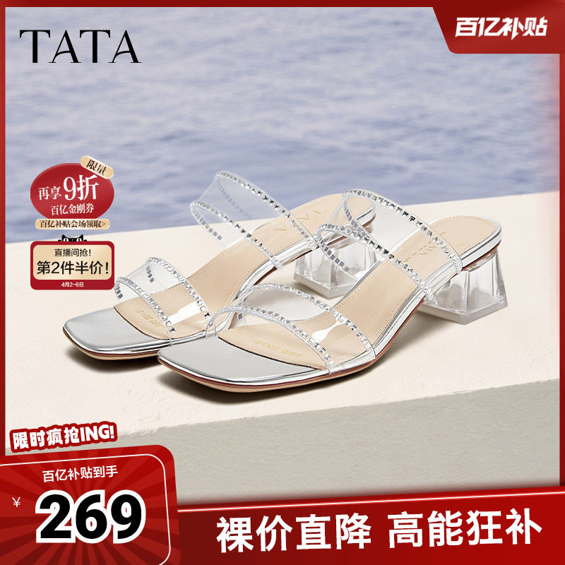 TATA他她法式透明底高跟拖鞋女外穿气质凉拖春季新款6AE03BT5奥莱