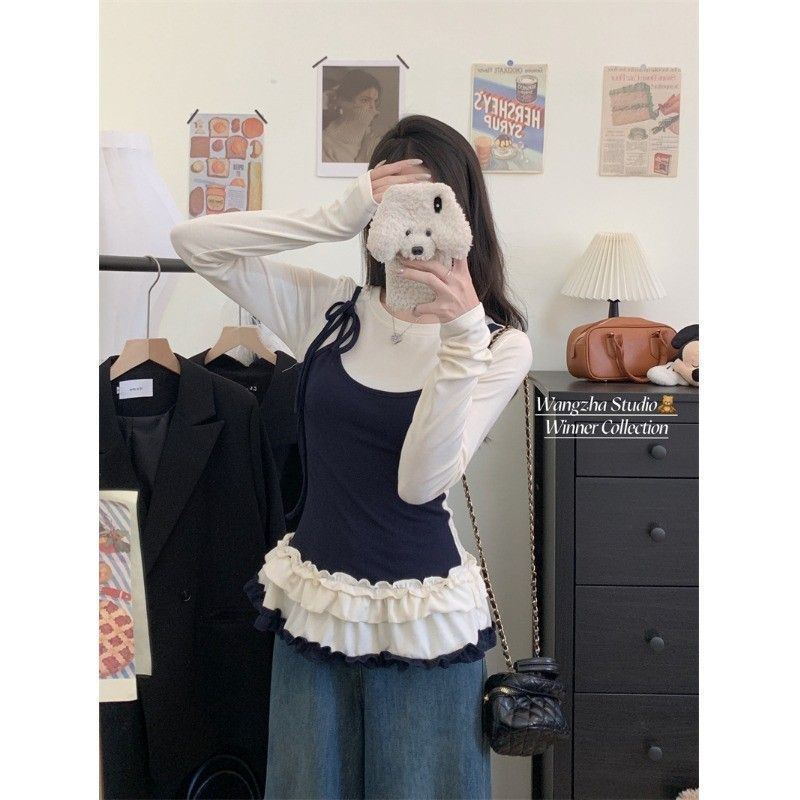 设计感荷叶边撞色假两件长袖t恤女春秋2025新款别致修身打底上衣
