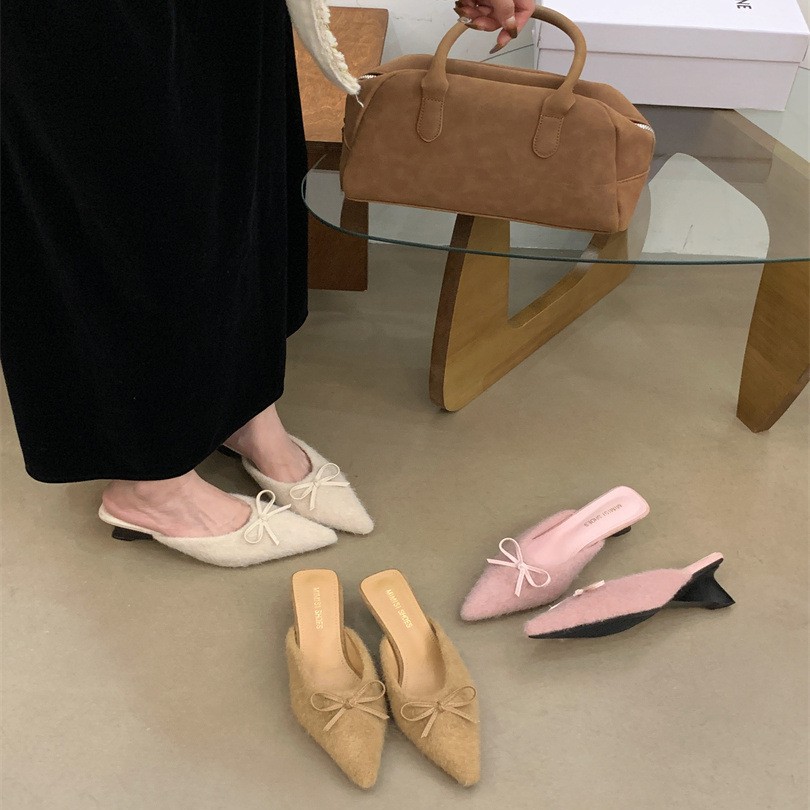 2025春季新款气质半托单鞋法式蝴蝶结灰色高跟鞋包头半拖鞋女