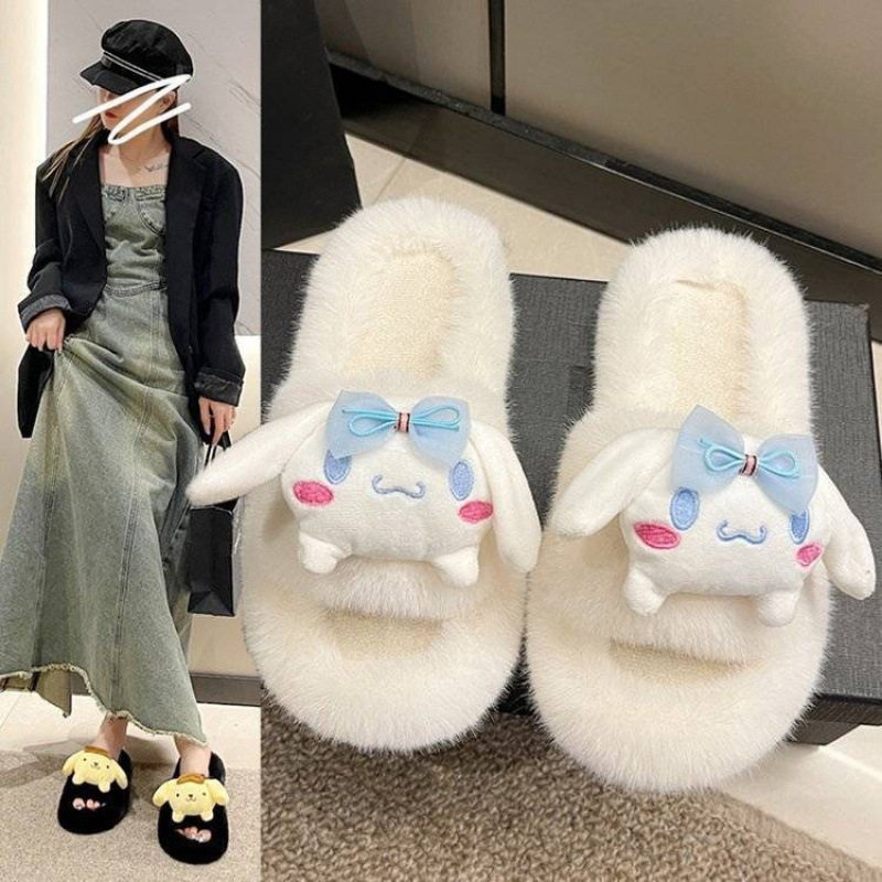 大耳狗秋冬新款毛毛拖鞋韩版时尚平底一字拖鞋玉桂狗毛绒拖鞋女生