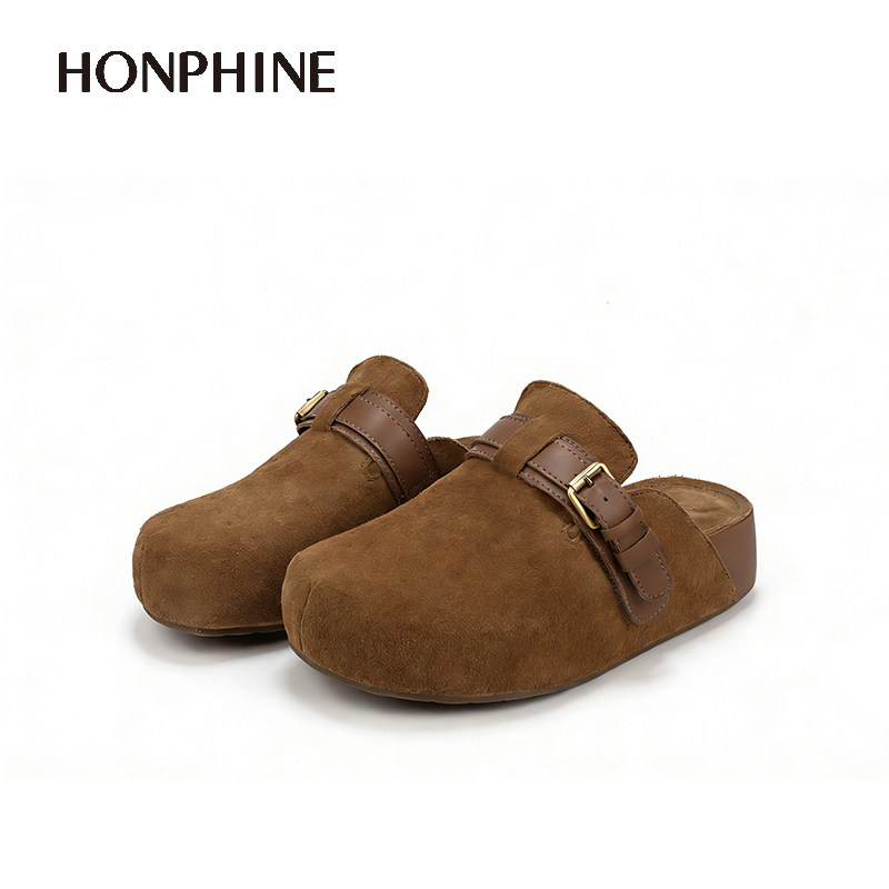 红粉知己勃肯鞋女2026新款棕色反绒皮包头拖鞋休闲百搭外穿一脚蹬