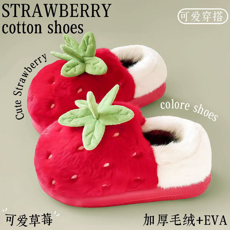 女士秋冬家居毛绒棉拖鞋卡通草莓保暖厚底防滑新款踩屎感