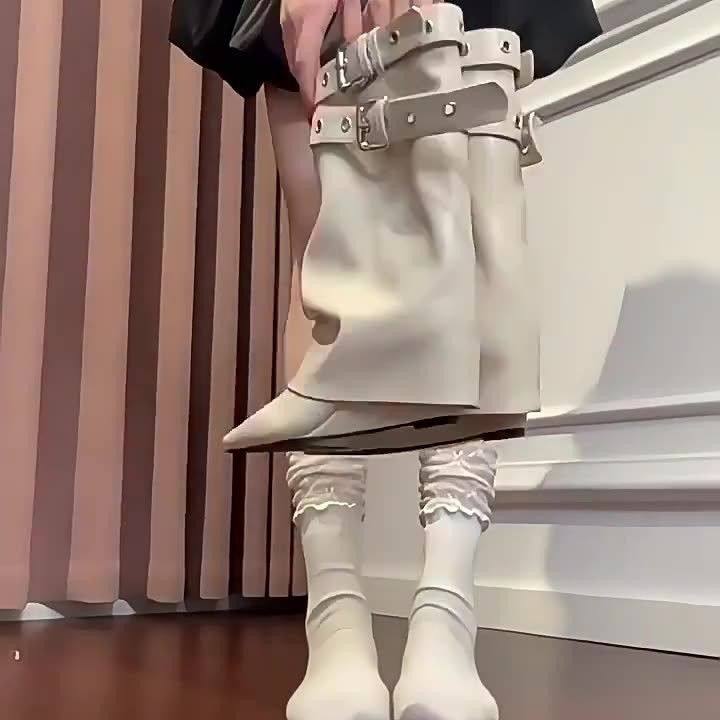 时装短靴小个子白色辣妹铆钉尖头裤管靴女骑士靴中筒堆堆靴短靴