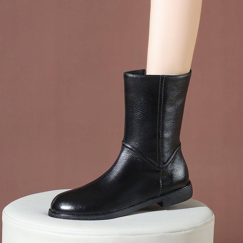 头层牛皮真皮短靴女秋冬加绒切尔西靴粗跟瘦瘦靴英伦风马丁靴