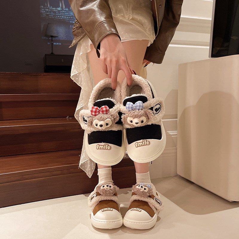 可爱小熊棉拖鞋女冬季外穿防滑居家室内厚底加绒包跟保暖棉鞋秋千