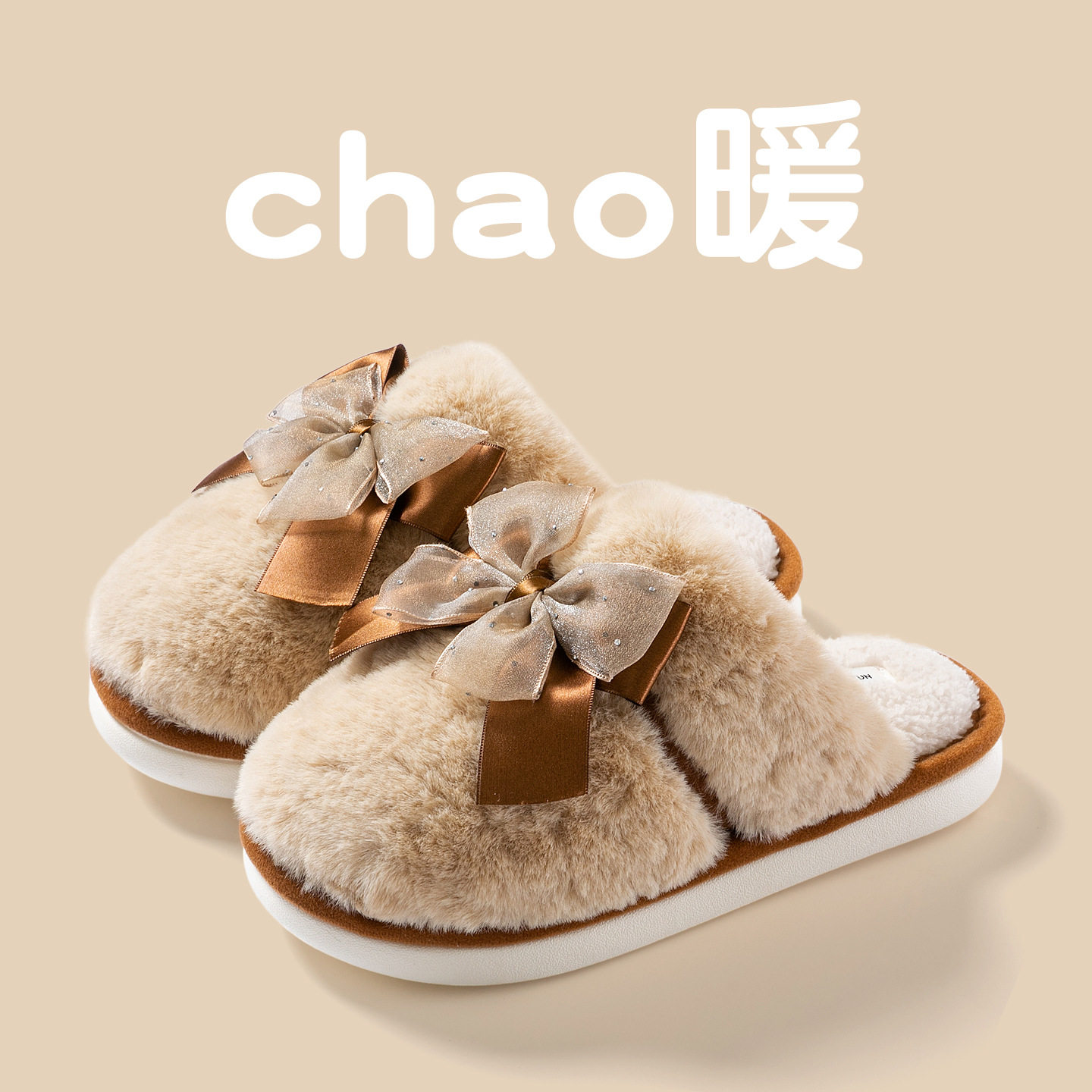 蝴蝶结毛绒棉拖鞋女秋冬季2025新款保暖室内居家软底防滑月子拖鞋