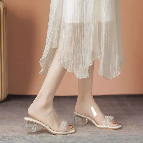 新款尖头细跟水钻高跟凉鞋不累脚外穿露趾透气小众高跟拖鞋仙女风