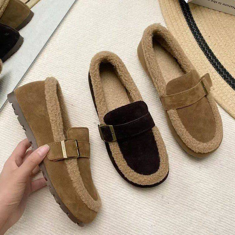 保暖乐福鞋女2025新款平底外穿豆豆鞋冬季加绒一脚蹬复古厚棉鞋女