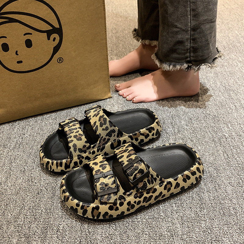 女士豹纹一字沙滩拖鞋夏季外穿厚底新款凉鞋平底休闲度假增高