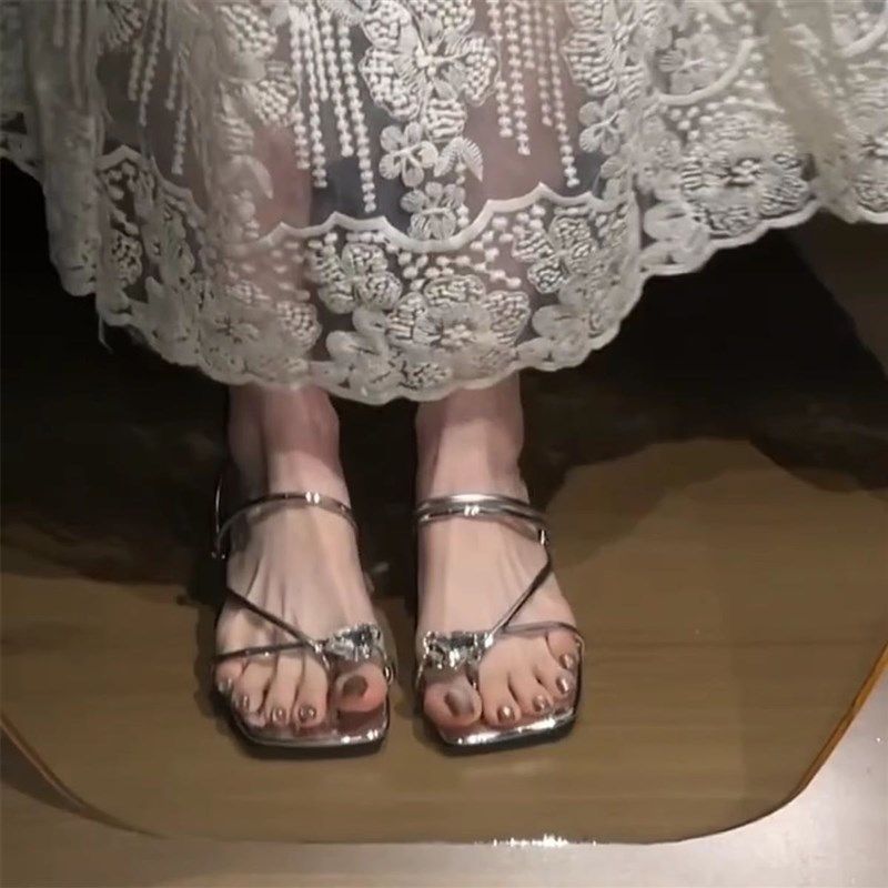 2025夏季新款法式仙女风凉鞋女露趾花朵细跟O水钻拖鞋气质高跟鞋