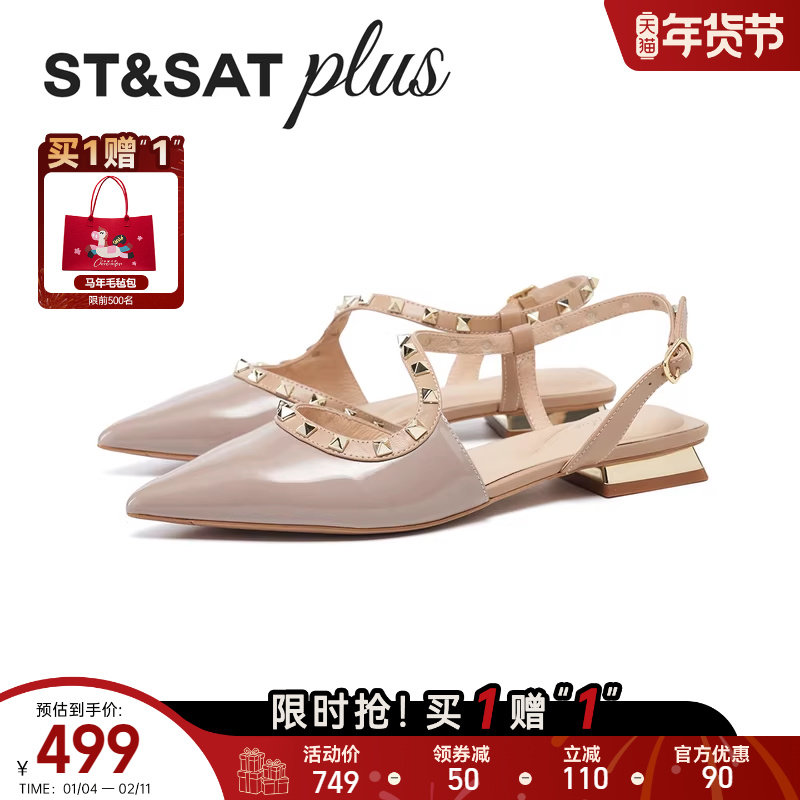星期六尖头铆钉2026春季粗跟凉拖鞋时尚简约包头女单鞋SSE1114005