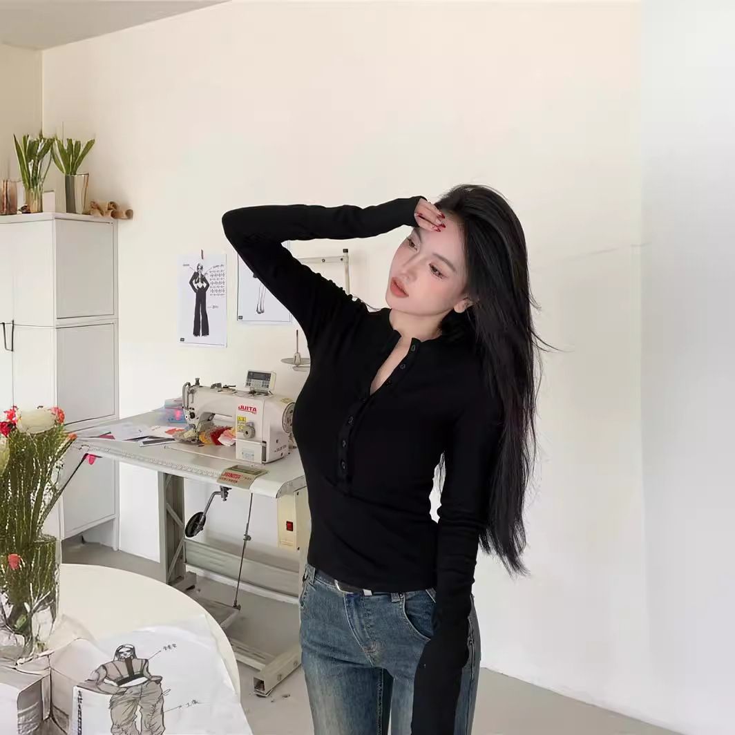 黑色长袖打底衫女春季新款设计感小众辣妹修身显瘦内搭T恤上衣